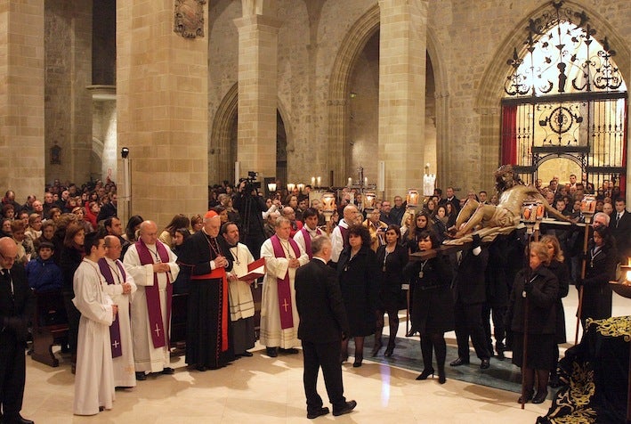 La Basílica Menor de Santa María de los Reales Alcázares acogió anoche un vía crucis claustral extraordinario del Cristo de la Noche Oscura con motivo del 50 aniversario de la hermandad ubetense de la que es titular. Un acto al que asistió monseñor Amigo Vallejo, quien además presidió la eucaristía previa, y que contó con la presencia de todas las cofradías de la localidad marcando cada una de las 15 estaciones.