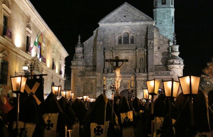 Fue emocionante ver el impresionante Cristo descoyuntado de Francisco Palma Burgos, adornado sólo con unas rosas a los pies de la cruz, dentro del Salvador y por la monumental plaza Vázquez de Molina. Cualquier perspectiva era una auténtica postal. Desde allí, cientos de personas siguieron el discurrir del vía crucis, compuesto por 15 estaciones y declamado por Ramón Molina Navarrete, Alfonso Miranda y María Teresa Ortiz.
