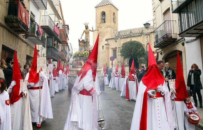 Los hermanos del Resucitado acompañaron a sus titulares e inundaron las calles de color blanco y rojo, y de sonidos alegres con los toques de su banda de trompetas y tambores anunciando la Resurrección de Cristo. A ellos se unieron, ante el paso de la Virgen, los niños de su banda joven y muchas mujeres ataviadas con la clásica mantilla, aunque en este caso cambiando el negro enlutecido por el blanco. Y cerrando el cortejo, un representante de cada cofradía ubetense con su correspondiente túnica estatutaria. Cuando rondaban las tres de la tarde se encerraba en su templo.