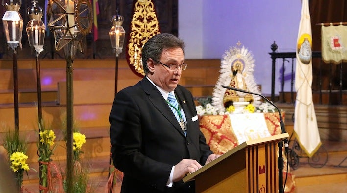 Fue presentado por Juan de Dios Peñas García-Blanca, quien destacó la calidad humana del pregonero, su predisposición a estar siempre que se le necesita ... y sus firmes creencias, todo lo cual lo ha sabido inculcar en su familia y en quienes le rodean. Tras un cariñoso abrazo, ocupó el atril Sáez Aparicio para hilar un pregón centrado en la figura de María como madre y protectora de todos.