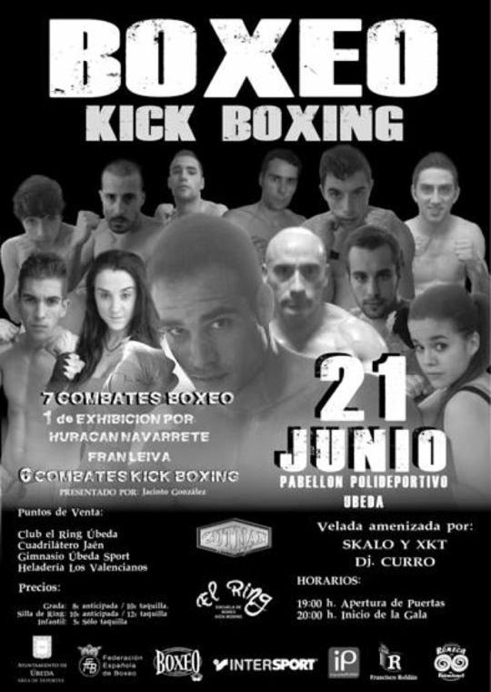 La velada incluirá siete combates de boxeo de púgiles federados, uno de exhibición con Huracán Navarrete y Fran Leiva, y seis combates de kick boxing, ... todo ello presentado por Jacinto González y con la amenización de DJ Curro, Skalo y XKT.