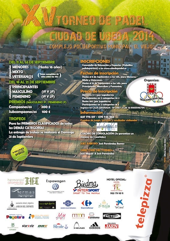 Del 11 al 14 de septiembre se disputarán las categorías de menores (hasta 16 años), mixto y veteranos (tener cumplidos 85 años entre los dos). ... Y del 18 al 21 de septiembre le tocará el turno a las categorías de principiantes, femenina 1ª y 2ª, y Masculina 1ª y 2ª. En el caso de este segundo fin de semana el periodo de inscripción permanece abierto hasta las dos de la tarde del día 15 de septiembre, en las oficinas del Complejo Polideportivo Municipal o en la web www.ubedapadel.es.