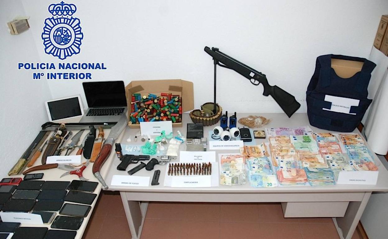 Entre otras cosas intervinieron 884 gramos de todo tipo de sustancias estupefacientes, la gran mayoría cocaína, dos armas de fuego, munición, 18 armas blancas, más de 60.000 euros, cuatro vehículos, cinco balanzas de precisión, 41 teléfonos móviles y un chaleco antibalas