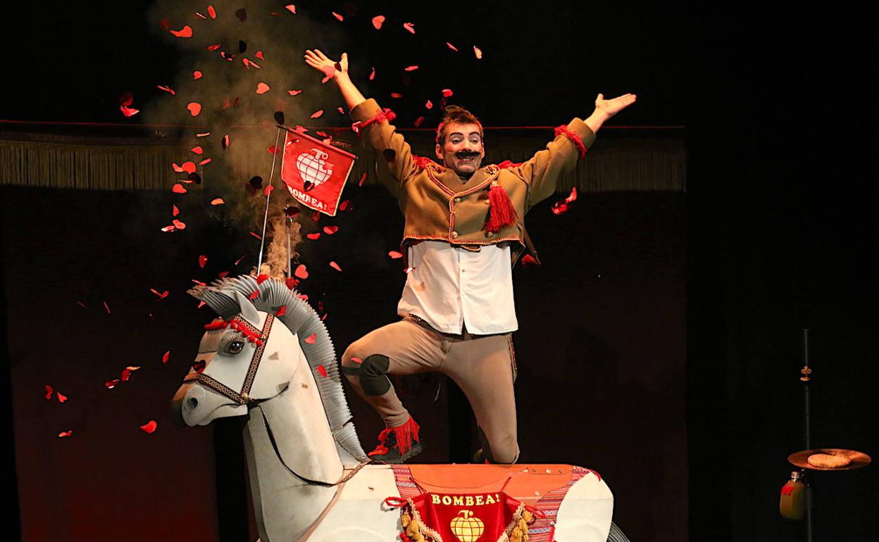 En este caso los presentes, de todas las edades, disfrutaron con 'Bombea!', teatro y clown a cargo de la compañía La Pulpa (Aragón). Un espectáculo que transmite dulzura en el que un peculiar personaje, el Presidente Vistaro (interpretado por Pablo Regalado), llega dispuesto a lanzar su mensaje antibelicista y a recordar que todos debemos estar unidos. Lo hace junto a su compañera Esperanza, una encantadora y gigantesca yegua de madera, que sorprende con su cola de catapulta, sus efectos de chispas y hasta con una cocina portátil bajo la silla de montar.