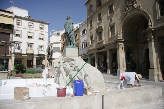 Varios operarios adscritos al servicio municipal de mantenimiento del Ayuntamiento de Úbeda han procedido en los últimos días al vaciado total de la fuente existente bajo el monumento dedicado al General Saro, el cual preside la céntrica plaza de Andalucía. El objetivo de esta intervención ha sido realizar diferentes tareas de limpieza y reparación en el interior. Era algo que necesitaba esta instalación, pues ya era mucha la suciedad acumulada en el agua, en la piedra y en el bordillo de este pequeño estanque, lo cual había hecho surgir ciertas críticas de los ciudadanos. Una vez vacía la fuente, se ha pintado todo el interior, que ya luce un aspecto renovado y da una mayor luminosidad al monumento.
