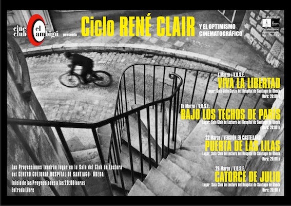 Se ha programado un ciclo dedicado a René Clair y el optimismo cinematográfico. Serán un total de cuatro proyecciones, todas ellas con entrada libre. Concretamente se pondrán las películas 'Viva la libertad' (1 de marzo), 'Bajo los techos de París' (15 de marzo), 'Puerta de las lilas' (22 de marzo) y 'Catorce de julio' (29 de marzo).
