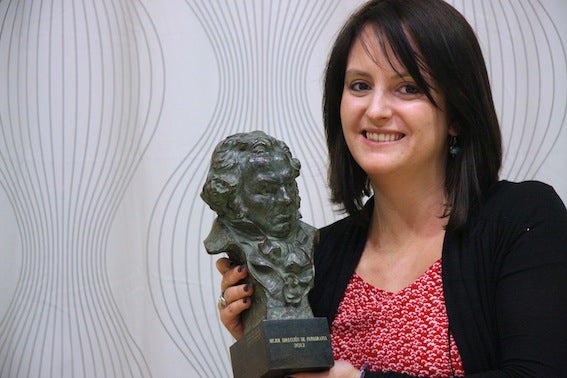 Ella es Jara Ruiz-Anchía, y aunque nació en California lleva tres años viviendo en Úbeda, donde actualmente trabaja como profesora de inglés en el centro Golden Poppy de la calle Aguilar Catena. Ella es una de las dos socias que montaron el pasado año esta academia basada en el aprendizaje mediante la conversación. Y claro, han sido muchos los alumnos que le han pedido poder ver el Goya de cerca, e incluso fotografiarse con él. Curiosamente, en casi todos los casos han coincidido en señalar que el busto no pesa tanto como parece.