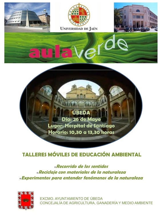 El centro cultura Hospital de Santiago de Úbeda acogerá el próximo sábado, día 26 de mayo, varios talleres móviles sobre educación ambiental dentro de la iniciativa denominada Aula Verde de la Universidad de Jaén. Habrá recorrido con los sentidos, reciclaje de materiales de la naturaleza y experimentos para entender fenómenos naturales, todo ello organizado con la colaboración de la Concejalía de Agricultura, Ganadería y Medio Ambiente del Ayuntamiento de Úbeda. Será entre las diez y media de la mañana y la una y media de la tarde en el centro cultural Hospital de Santiago.