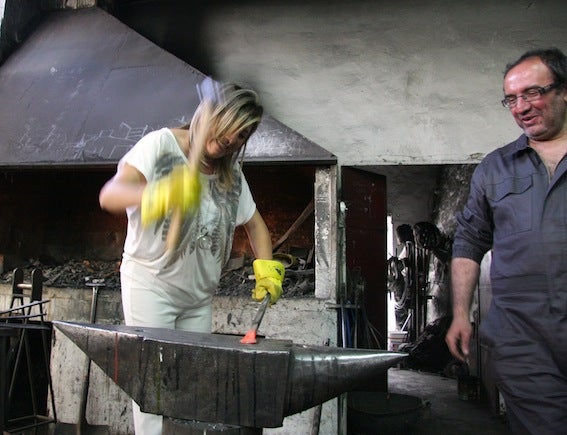 Para conocer su trabajo, la delegada provincial de Turismo, Comercio y Deporte, Pilar Salazar, visitó ambos talleres y se interesó por su labor y trayectoria, ... conversando con los responsables de los mismos. Asimismo, aprovechó para destacar la labor de los artesanos, que han sabido mantener sus oficios a base de constancia y buen hacer. Incluso se animó y probó su destreza moldeando el hierro incandescente sobre el yunque a base de golpes de martillo.