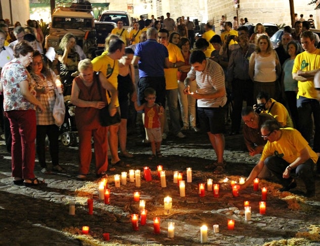 Un tímido reguero de ciudadanos iniciaba la concentración ataviados con amarillas camisetas reclamantes, amarillas camisetas que bajo el lema 'Salvemos San Lorenzo' expusieron de manera gráfica el sentir de un pueblo que se niega a la desaparición de su legado arquitectónico. Un símbolo, en definitiva, que se vio enriquecido con la colocación de velas que, sobre un círculo central a pie de calle, iluminaron esperanzadamente las expectativas puestas en un deseo que no termina de hacerse realidad y cuya materialización queda nuevamente en manos de los responsables: Obispado y administraciones.
