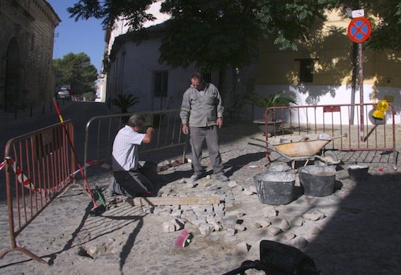 El Ayuntamiento de Úbeda, a través de su área de Mantenimiento, está interviniendo en la plaza de San Lorenzo de Úbeda y en sus alrededores para reparar un buen número de baches surgidos al despegarse algunas piezas del adoquinado. Cuando una de estas piedras se desprende, poco a poco y debido al tránsito de vehículos, lo van haciendo las que están alrededor, con lo cual se genera un socavón considerable.