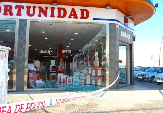 Tras varios intentos debido a la dureza del cristal, el coche ha penetrado por el ventanal en el que se mostraban los aparatos de climatización ( ... braseros, calefactores, radiadores, etcétera). No es que esos fueran el objetivo del asalto ante la previsión de una bajada de las temperaturas. Simplemente era el escaparate más accesible para empotrar un coche desde la calle con cierto impulso.