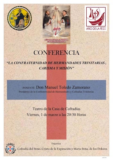 El teatro de la Casa de Cofradías acogerá hoy viernes, día 1 de marzo, a partir de las ocho y media de la tarde, una conferencia presentada bajo el título 'La Confraternidad de Hermandades Trinitarias, carisma y misión'. Se trata de una actividad organizada por la cofradía del Santísimo Cristo de la Expiración y María Santísima de los Dolores que estará protagonizada por Manuel Toledo Zamorano, presidente de la Confraternidad de Hermandades y Cofradías Trinitarias.