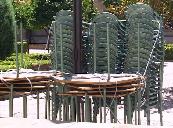 Úbeda se queda sin terrazas. Bares, cafeterías y demás establecimientos hosteleros de la localidad han decidido unirse y dejar las mesas y sillas amontonadas como medida de protesta contra la importante subida (un 32 por ciento) de las tasas municipales por la instalación de terrazas en la vía pública que aprobó el Ayuntamiento. Para informar a los clientes, en sus locales han colgado un cartel que reza: «no puedo montar terraza, es imposible hacer frente al pago de la licencia con la actual subida de los impuestos. «Esperamos una solución por parte del Ayuntamiento», añaden, y terminan con el clásico «disculpen las molestias».
