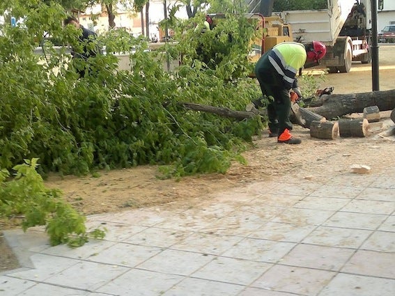 Según explicó el concejal de Mantenimiento, José Antonio Jiménez, las fuertes rachas de viento de los pasados meses resquebrajaron tres árboles de la especie olmo, cuya madera presenta gran fragilidad. De hecho, sus ramas acabaron cayendo sobre el mobiliario, suponiendo «un importante peligro para los peatones», por lo que «hubo que rebajarlos en cruz». Estos tres ejemplares están siendo sustituidos por una especie más dura que el olmo y con mayor durabilidad como son los bordos (también llamados arces americanos).