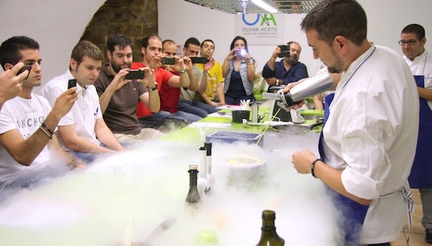 De una forma amena, cercana y participativa, los dos cocineros han mostrado su forma de obtener distintas texturas a base de pasar el aceite por líquido de nitrógeno a una temperatura de 196 grados bajo cero. Así, por ejemplo, han presentado su sémola de aceite (llamada así por su aspecto) obtenida tras espolvorear un arbequina en el nitrógeno con la ayuda de un sifón y servida con un poco de pan tostado y ajo picados por encima. «Es como una tostada, pero al revés», ha explicado García, destacando que en boca el aceite se derrite y se puede apreciar todo su sabor.