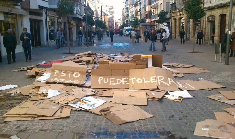 Esta mañana, cansados de la falta de respuestas por parte del Ayuntamiento y a modo de protesta, han recogido todos los cartones que hacen las veces de colchones para los temporeros y que se han venido acumulando día a día, y los han sacado a plena calle Obispo Cobos, escribiendo sobre ellos la frase «esto no se puede tolerar». Con ello esperan que el Consistorio reaccione y tome cartas en el asunto.