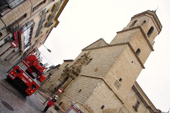 Los Bomberos de Úbeda han tenido que intervenir este mediodía en la fachada lateral de la iglesia de la Santísima Trinidad, donde se ha registrado el desprendimiento de una teja. Afortunadamente nadie pasaba por allí en ese momento y, por muy poco, no ha coincidido con el horario de salida de los alumnos del colegio anexo.