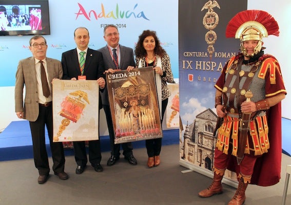 Las cornetas y tambores de la Centuria Romana, que este año celebra el centenario de su primera salida procesional, serán así los embajadores de Úbeda ... en esta edición de Fitur, tras la presentación este viernes del cartel de Semana Santa ubetense. «Qué mejor muestra de la idiosincrasia de nuestra semana mayor, única en el mundo», aseguró el alcalde, José Robles, en la presentación del cartel de 2014, acompañado por el presidente de la Unión de Cofradías, José Ramón López-Agulló, el mecenas de la Centuria, Javier Vera, y una representación de los 80 componentes que desfilarán en Fitur.