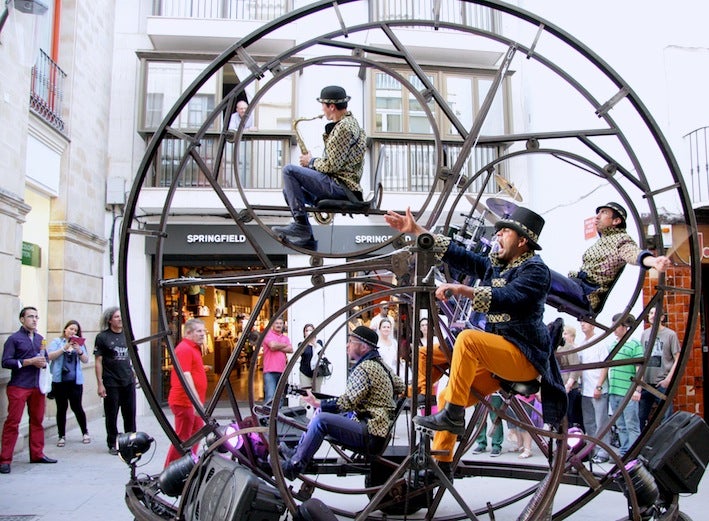 Dentro de la Feria de la Música que durante toda esta semana está ofreciendo espectáculos gratuitos en diferentes puntos de la localidad para clausurar el vigésimo sexto Festival Internacional de Música y Danza 'Ciudad de Úbeda', en la tarde-noche de ayer sábado recorrió las calles del centro 'El Rodafonio', una rueda de cuatro metros de altura sobre la que fueron montados tres músicos (saxofón, guitarra y percusión), y dos personas más pedaleando para generar el movimiento y dar forma a un espectacular pasacalles.
