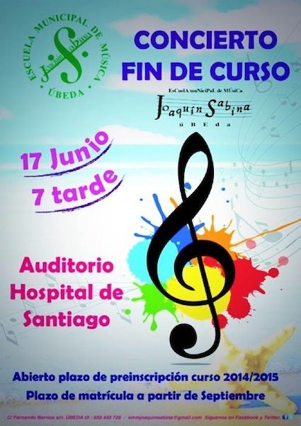 La Escuela Municipal de Música 'Joaquín Sabina' de Úbeda clausura hoy martes su año académico con un concierto de final de curso en el que más de 80 intérpretes demostrarán lo aprendido durante el último año. Será en el auditorio del Hospital de Santiago a partir de las siete de la tarde. Y los participantes harán gala de la ilusión, atrevimiento, tesón y profesionalidad que ya han dejado patente en las diferentes actuaciones de este curso.