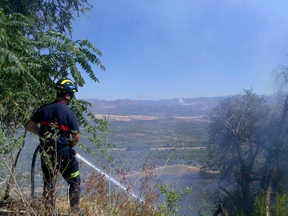 Pero mientras trabajaban en su extinción fueron alertados de otro fuego producido en la localidad de Jódar (como se aprecia al fondo en la foto), ... donde hubo que enviar otro retén del parque ubetense. En este caso, el incendio quedó controlado a eso de las seis y media de la tarde.