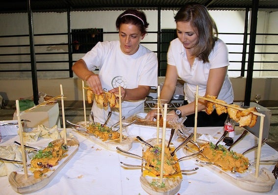 Los comensales degustaron tapas como salmorejo de cereza con anchoa y parmesano; tartar de trucha con alioli, pepinillo y aguacate; falsa cereza de foie con ... tierras de aceite de oliva; falsa trufa de crema con tierras de pan de especies; burritos rellenos regados con mahonesa de curry; falsa aceituna rellena de queso de cabra y anchoas; falso guiso de chipirones; barcaza de lomo de orza y humus de berenjena; sashimi de presa ibérica con mahonesa de sésamo y vinagreta de frutos secos; y carrillada de cerdo ibérico con ajoatao. Y de postre, gin tonic de manzana verde y tocino de cielo con helado de coco y chantillí.