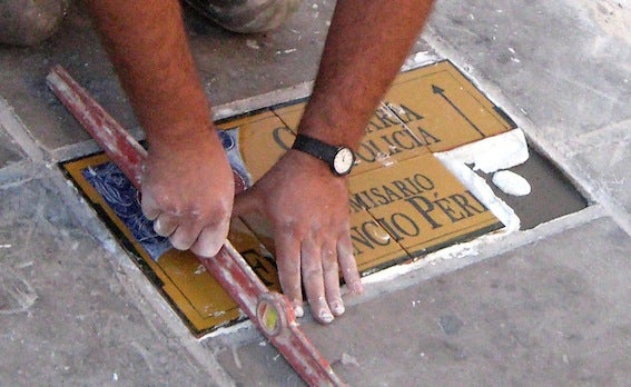 Hoy, en el suelo, donde estaba la placa y vuelve a haber cemento, alguien ha escrito con pintura: «aplastemos, apaguemos la poesía, las ideas, los sueños, y será la pereza, el abandono, casi la muerte nuestro Patrimonio de la Humanidad». Lástima que en una iniciativa como ésta no hayan coincidido desde el principio los deseos ciudadanos y el interés de la administración.