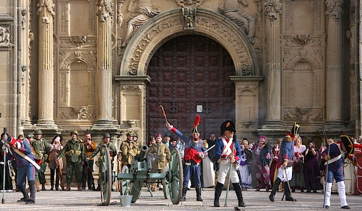Desfilaron desde el Hospital de Santiago hasta la monumental plaza Vázquez de Molina, donde cada uno de los grupos de recreación, llegados desde diferentes puntos ... de la geografía nacional, hizo su entrada con música alusiva a la época que representaba. Se dispararon además algunas salvas, incluso con un cañón que hizo retumbar todo el entorno. Y se escenificó una escaramuza entre tropas enemigas.