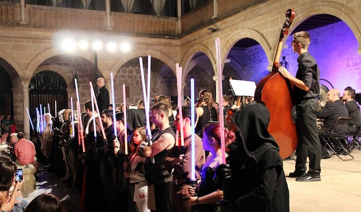 La segunda velada musical llegó el sábado con el 'Cinefan Concert', dirigido por Juan Antonio García Mesas ante 700 espectadores. Por tercer año consecutivo repitió la Banda Sinfónica de Jaén para recordar grandes sagas como 'Jurassic Park', 'El señor de los anillos' o 'Regreso al futuro', y homenajear a Basil Poledouris en la segunda parte del concierto con títulos como 'Conan el bárbaro'. Y como ya es habitual, al sonar las melodías de 'Star Wars' muchos de los asistentes levantaron sus sables láser ceremoniosamente.