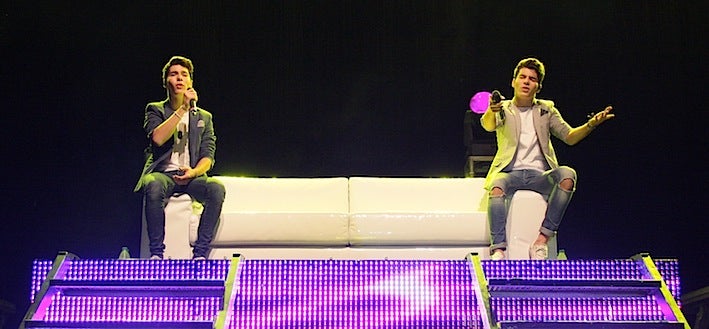Durante una hora y cuarto, aproximadamente, el público, totalmente entregado, coreó desde la primera a la última estrofa, sin parar de gritar a estos dos jóvenes que han crecido mucho desde que aparecieron a los cuatro años en el programa 'Menuda Noche', en el que participaron en más de doscientas emisiones antes de dar el salto al estrellato hace año y medio como dúo en 'La Voz Kids' con el trampolín de las redes sociales.