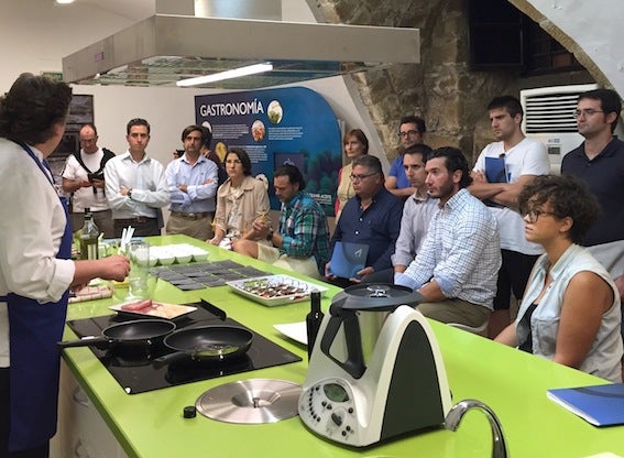 Por otro lado, en un apartado más sofisticado y comercial, se vieron conceptos básicos de la sumillería de aceite. Y la última sesión del curso se destinó al aceite de oliva virgen extra y su maridaje, impartiéndose un showcooking que corrió a cargo de Anselmo Juarez, chef del restaurante Zeitum, quien elaboró tres platos. Fueron tartar de atún rojo macerado con cebolla tierna y mango con aceite variedad Cobransosa, vieira salteada con crema de calabaza emulsionada con aceite Gordalilla y melva confitada en aceite Pico Limón con yogur de aceite y salpicón de marisco.