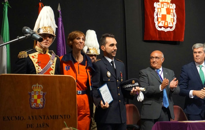 El ubetense Sergio Sancho Martos, agente de la Policía Local de Jaén desde hace años, y su compañero Miguel Ángel Castro Ariza, han recibido este miércoles la Cruz al Mérito Policial con distintivo rojo concedida por el pleno del Ayuntamiento de la capital y además han sido distinguidos de forma especial por la Empresa Pública de Emergencias Sanitarias 061. Ha sido así por su pronta y eficaz intervención ante un hombre de 47 años de edad que había sufrido una pérdida súbita de consciencia mientras caminaba por una calle jiennense el pasado mes de junio.