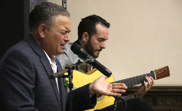 El salón de actos de la UNED acogió la presentación de 'Cantes a Miguel Hernández', el nuevo disco del cantaor ubetense Francisco Delgado 'Tato' con el que evoca la figura del universal poeta de Orihuela. Un trabajo que rebosa talento, en los textos, en los cantes y en los toques de guitarra, cuyo contenido pudieron conocer de primera mano los numerosos asistentes al acto gracias a que el propio 'Tato' interpretó algunos de los temas acompañado a la guitarra por Francisco Orcera (Paco 'Chorobo'), quien ha puesto en el CD los arreglos y el diseño.
