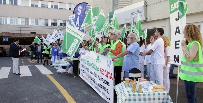 Los sindicatos profesionales e independientes de sanidad en la provincia de Jaén, Satse (Sindicato de Enfermería), SAE (Sindicato de Auxiliares de Enfermería) y Fate (Sindicato de Técnicos), desarrollaron este jueves una concentración ante el hospital San Juan de la Cruz de Úbeda dentro del calendario de movilizaciones que vienen desarrollando en los hospitales del Servicio Andaluz de Salud durante el mes de noviembre y que culminará con una gran concentración ante la Delegación del Gobierno de la Junta en Jaén el día 26 de noviembre. Buscan restaurar la jornada laboral de 35 horas, recuperar los salarios retraídos, aumentar el empleo y devolver íntegramente la paga extra de Navidad de 2012.