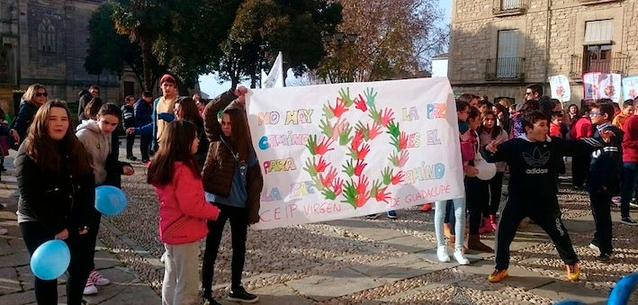 Posteriormente se desarrolló una marcha por la paz en la que los presentes lucieron numerosas pancartas elaboradas previamente en clase con mensajes pacifistas alusivos al tema de la jornada. Recorrió Obispo Cobos, Mesones, plaza de Andalucía, plaza del Doctor Quesada, Real, Juan Montilla, plaza del Ayuntamiento y Pasaje de Jesús Nazareno, para desembocar en la monumental plaza Juan Vázquez de Molina.