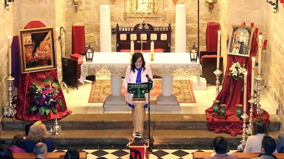 Hechas las presentaciones, ocupó el atril María Carrascosa. Un atril que estuvo flanqueado por dos cuadros, uno de San Juan Bosco y María Auxiliadora, dada su vinculación a Salesianos, y otro de la Sentencia, hermandad organizadora. Y a sus pies, elementos de las cofradías a las que pertenece, como unas sandalias del Prendimiento o varios faroles de los que portan los hermanos de Nuestra Señora de Gracia.