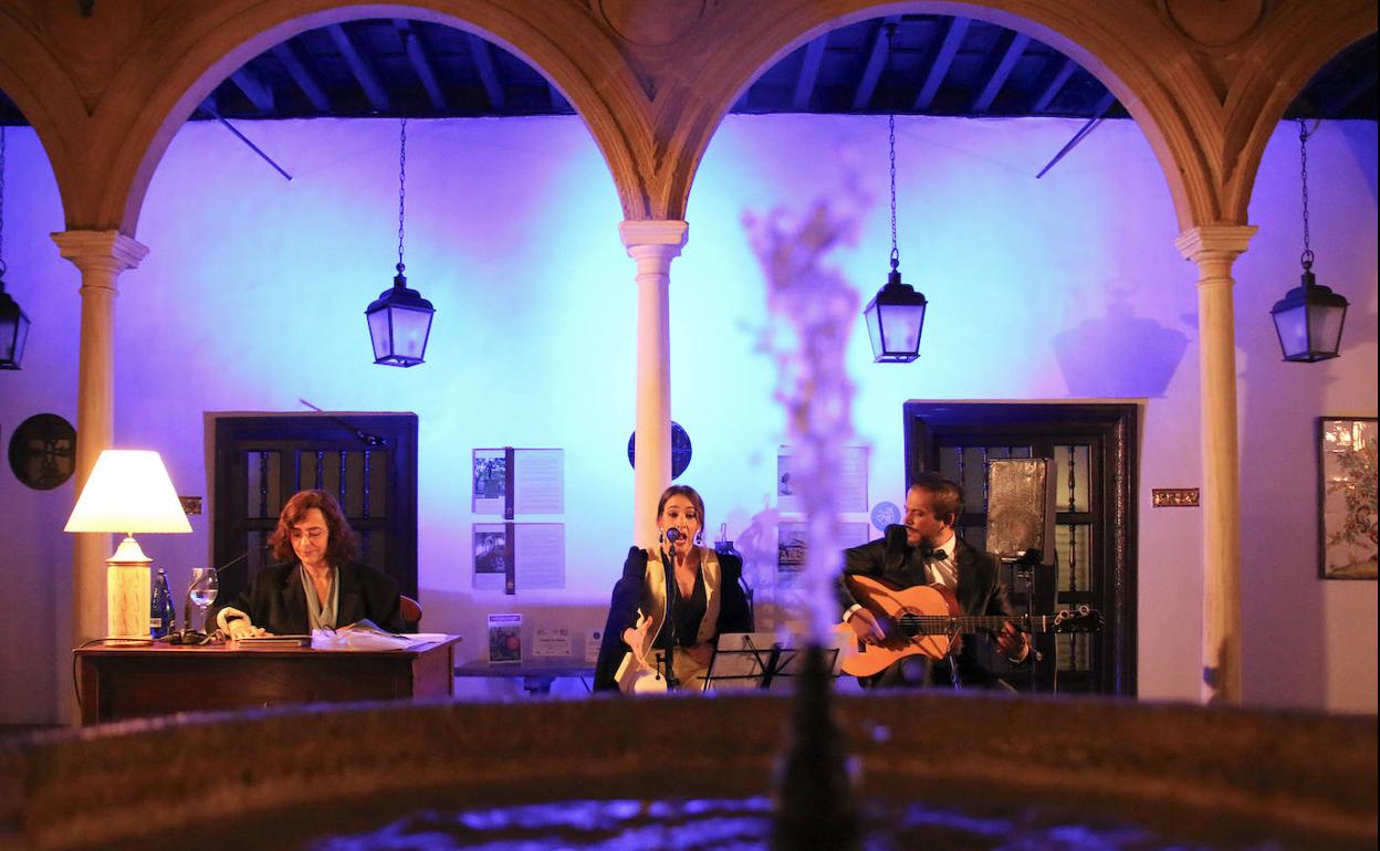 Precisamente, algunos ejemplos de ello pudieron escucharse durante la ponencia gracias a la presencia de la cantaora Belén Vega, que fue intercalando algunos cantes acompañada a la guitarra por José Romero 'el Torro'. Toda una delicia escuchar su voz frente al arrullo del agua de la fuente que marca el centro del patio del antiguo palacio convertido en Parador.