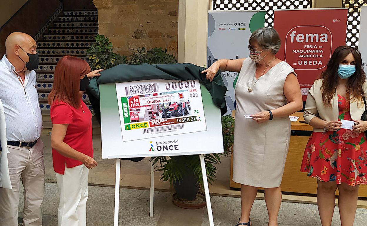 La ONCE dedicará el sorteo de fin de semana del sábado 18 de septiembre a la 39 edición de la Feria de la Maquinaria Agrícola ... de Úbeda (FEMA), que tendrá lugar del 15 al 18 en la ciudad Patrimonio de la Humanidad. Y lo hará con una imagen impresa en cinco millones y medio de cupones que fue presentada por la directora de la entidad en Jaén, Rosario Sedano, quien estuvo acompañada por la alcaldesa, Antonia Olivares, el concejal de Comercio, José Luis Madueño, y el de Agricultura, Javier Gámez, junto a la directora de la ONCE en Úbeda, María Luisa Garzón, y la consejera territorial, Irene Jiménez.