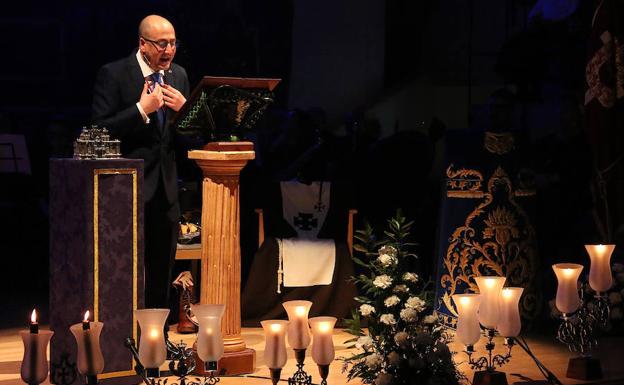 Entre una gran emoción ocupó el atril Rafael Martínez Redondo, arropado por todas las banderas de las cofradías de la ciudad y rodeado de algunos elementos de las cuatro hermandades a las que pertenece. De la Real Cofradía del Santísimo Cristo de la Humildad colocó una vestimenta de la banda de romanos que durante tantos años lució así como dos antorchas; del Cristo de la Noche Oscura y de Nuestro Padre Jesús Nazareno sus dos túnicas; y de Nuestra Señora de Gracia una salla de la Virgen, su propio traje de capataz y el llamador del paso que acciona en la noche del Lunes Santo. Además, en la línea delantera del escenario, junto a las clásicas flores, estuvieron encendidas las tulipas de todas las hermandades del Viernes Santo.