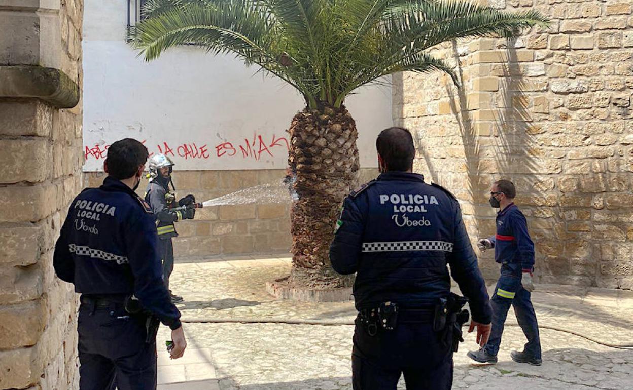 Los Bomberos de Úbeda tuvieron que sofocar un pequeño incendio registrado en la palmera que está situada junto a la Torre Octogonal y la antigua ... puerta del lienzo de muralla que separa las calles Ventanas y Corredera de San Fernando. Recibieron el aviso antes de las dos de la tarde de este miércoles tras generarse una gran cantidad de humo que hacía temer que las llamas acabaran afectando a toda la planta.