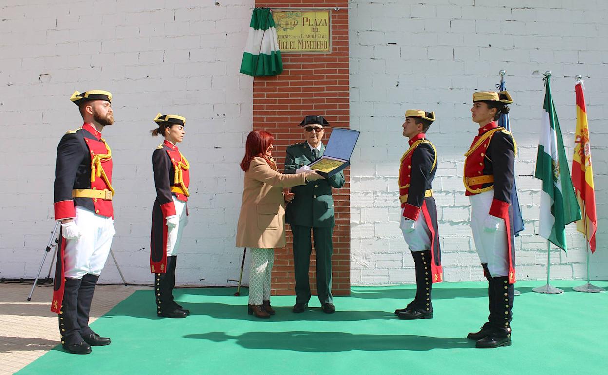 Tras el descubrimiento de la placa por la alcaldesa de la ciudad, Antonia Olivares, y el coronel Miguel Monedero, se le regaló al homenajeado una réplica a escala del azulejo que ya luce en la plaza que lleva su nombre. Durante la cita se pudieron escuchar sentidas y cariñosas palabras por parte de las personas que intervinieron. Se trató del presidente de la Hermandad de Amigos del Benemérito Cuerpo de la Guardia Civil, Fernando Gámez de la Blanca, el general de brigada de la Guardia Civil, Antonio Parrilla, y la regidora local.