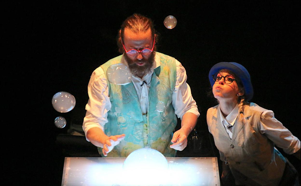 El humor es una licencia permanente en el espectáculo, también la implicación del público, aunque la magia sucede cuando encienten su mesa de luz y sobre ella comienzan a crear pompas de jabón con la ayuda de tubos y otros cachivaches. Las hay grandes y pequeñas, que suben y bajan hasta desaparecer al contacto con los focos o el suelo, llenas de humo… También hay pompas dentro de pompas que a su vez están dentro de otras pompas, pompas que se multiplican en otras pompas, o pompas inflamables que explotan entre una gran llamarada. Incluso en el show es posible ver una pompa cuadrada, con forma de cubo. ¿Se puede pedir más? Pues sí. En la parte final surgen unas pompas tan gigantescas que son capaces de envolver a una persona.