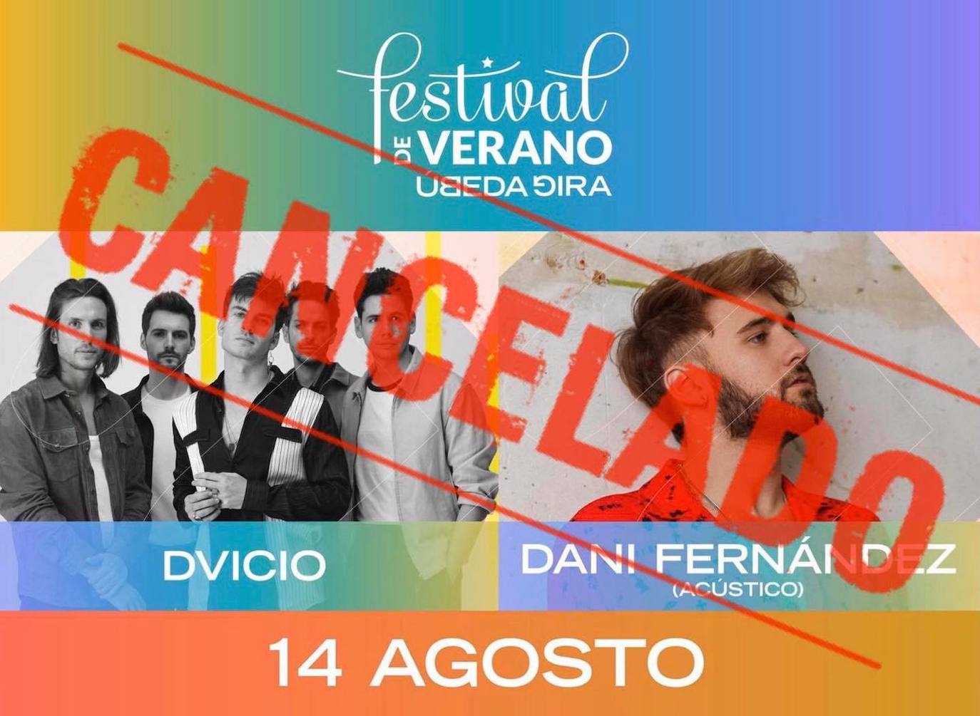 El Festival de Música de Verano de Úbeda (FestMuve) ha anunciado, en sus redes sociales, la suspensión del concierto de Dani Fernández y el grupo ' ... Dvicio', que estaba previsto que tuviera lugar el próximo viernes 14 de agosto en la plaza de Úbeda.